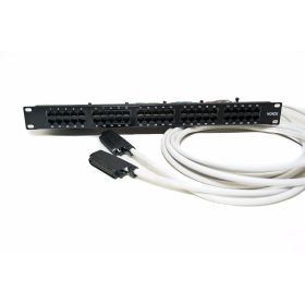 19” Rack Mounting. Front Fully populated with 24 RJ45 modules. RJ45 Pins active on 4 & 5. RJ21 Telco tail 90, 180 or 120 degree hood. Individual slide marking system RJ21 Telco terminated directly on to the RJ45 Panel, 2mt lead as standard. Active on the voice pair of each socket (pins 4&5). Simply plug the RJ21 connector into your voice gateway to provide connectivity. Terminated RJ21 telco can be manufactured to any cable length required.